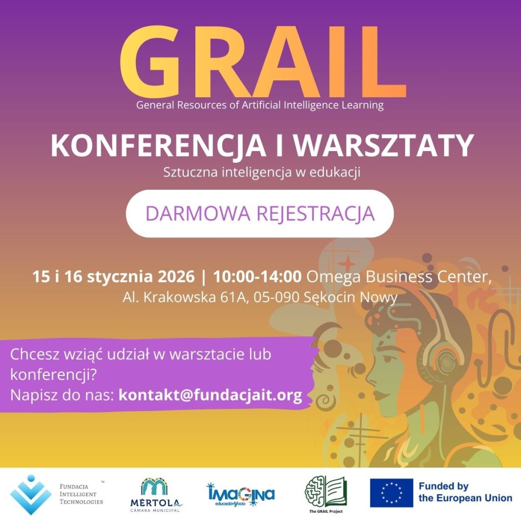 Fundacja Intelligent Technologies zaprasza do udziału w bezpłatnych warsztatach oraz konferencji będących częscią międzynarodowego projektu GRAIL – General Resources of Artificial Intelligence Learning, realizowanego w ramach programu Erasmus+ (VET) we współpracy z partnerami z Polski, Hiszpanii i Portugalii.